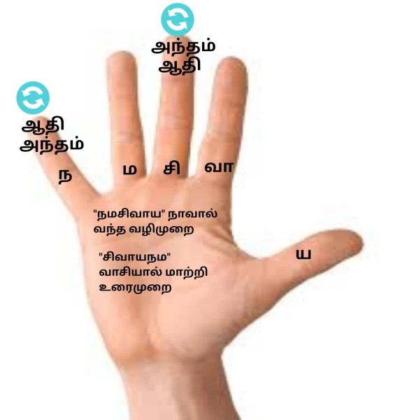 அதாவது ‘நம’ என ‘ஆதி சிறுவிரல்’ மற்றும் மோதிர விரல் மூலமாக தொடங்கி, ‘சிவாய’ என்று ‘அந்தம் நடுவிரல்’, ஆள்காட்டி விரல், மற்றும் கட்டை விரல் வழியாக நாவின் வழியே நமசிவாய என்று வெளியே குரலாக உச்சரிக்கப் பட்டு முடிவடைகிறது.