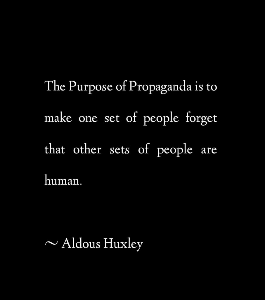 The Purpose of Propaganda is to make one set of people forget that other sets of people are human. ~ Aldous Huxley