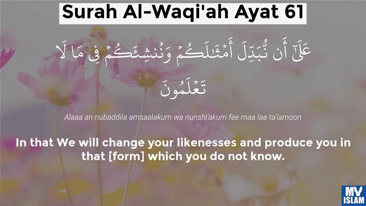 குர்ஆனின் 56:61 வசனம் கூறுகிறது, “அதில் உங்கள் உருவங்களை மாற்றி, நீங்கள் அறியாத வடிவத்தில் உங்களை உருவாக்குவோம்.” மனிதர்களை மண்ணாகவோ, விலங்குகளாகவோ, கற்களாகவோ மாற்றுவது போன்ற அவர்களுக்குத் தெரியாத வடிவத்தில் மனிதர்களை மாற்றியமைக்கும் ஆற்றல் அல்லாஹ்வுக்கு உண்டு என்பதை இந்த வசனம் உணர்த்துகிறது.