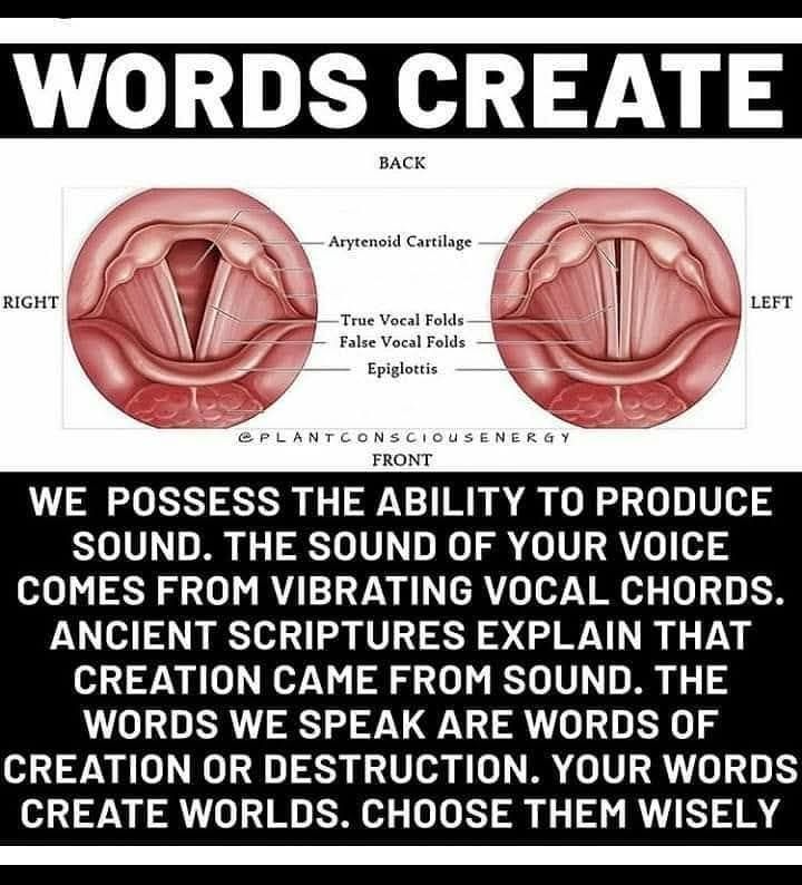 WE POSSESS THE ABILITY TO PRODUCE SOUND. The sound of your voice COMES FROM VIBRATING VOCAL CORDS. ANCIENT SCRIPTURES EXPLAIN THAT CREATION CAME FROM SOUND. THE WORDS WE SPEAK ARE WORDS OF CREATION OR DESTRUCTION. YOUR WORDS CREATE WORLDS. CHOOSE THEM WISELY.