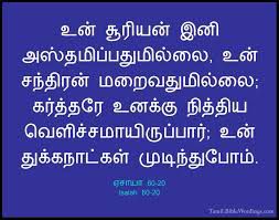 உன் சூரியன் இனி அஸ்தமிப்பதுமில்லை, உன் சந்திரன் மறைவதுமில்லை; கர்த்தரே உனக்கு நித்திய வெளிச்சமாயிருப்பார்; உன் துக்கநாட்கள் முடிந்துபோம்.