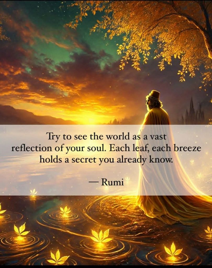 பூமி, நீர், காற்று, நெருப்பு மற்றும் விண்வெளி ஆகிய ஐந்து கூறுகளைக் கொண்ட பிரபஞ்சத்தின் பரந்த பிரதிபலிப்பாக உங்கள் இருப்பை அங்கீகரிக்க முயற்சிக்கவும். முழு பிரபஞ்சத்தில் உள்ள ஒவ்வொரு அணு துகளும் உங்கள் அணு துகள்-அதாவது உங்கள் ஆன்மா-ஏற்கனவே அறிந்த பல ரகசியங்களை வெளிப்படுத்துகின்றன. – ரூமி
