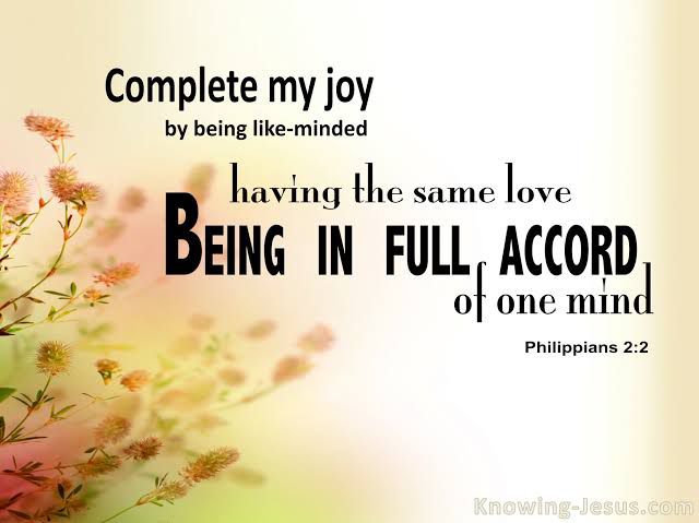 நீங்கள் ஏக சிந்தையும் ஏக அன்புமுள்ளவர்களாயிருந்து, இசைந்த ஆத்துமாக்களாய் ஒன்றையே சிந்தித்து, என் சந்தோஷத்தை நிறைவாக்குங்கள்.