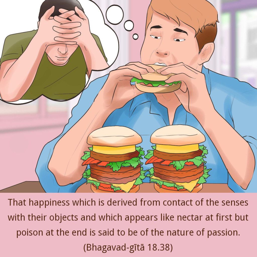In Bhagavad Gita 18:38, Sri Krishna teaches that “Happiness is said to be in the mode of passion when it is derived from the contact of the senses with their objects.” Such happiness is like nectar at first but poison at the end.”