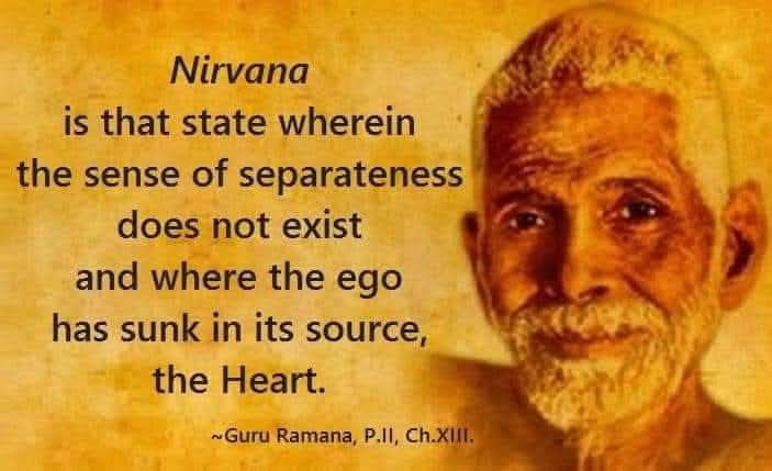 Nirvana is that state where the sense of separateness does not exist and where the ego sinks into its source, the heart. ~Guru Ramana.