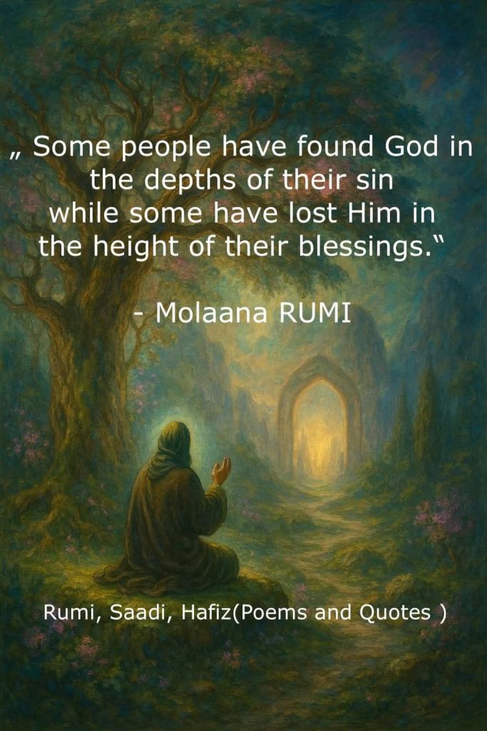 சிலர் தங்கள் பாவத்தின் ஆழத்தில் இறைவனைக் கண்டடைந்துள்ளனர், வேறு சிலரோ தங்கள் ஆசீர்வாதங்களின் உச்சத்தில் அவரை இழந்துள்ளனர். -ஹஜ்ரத் மௌலானா ரூமி