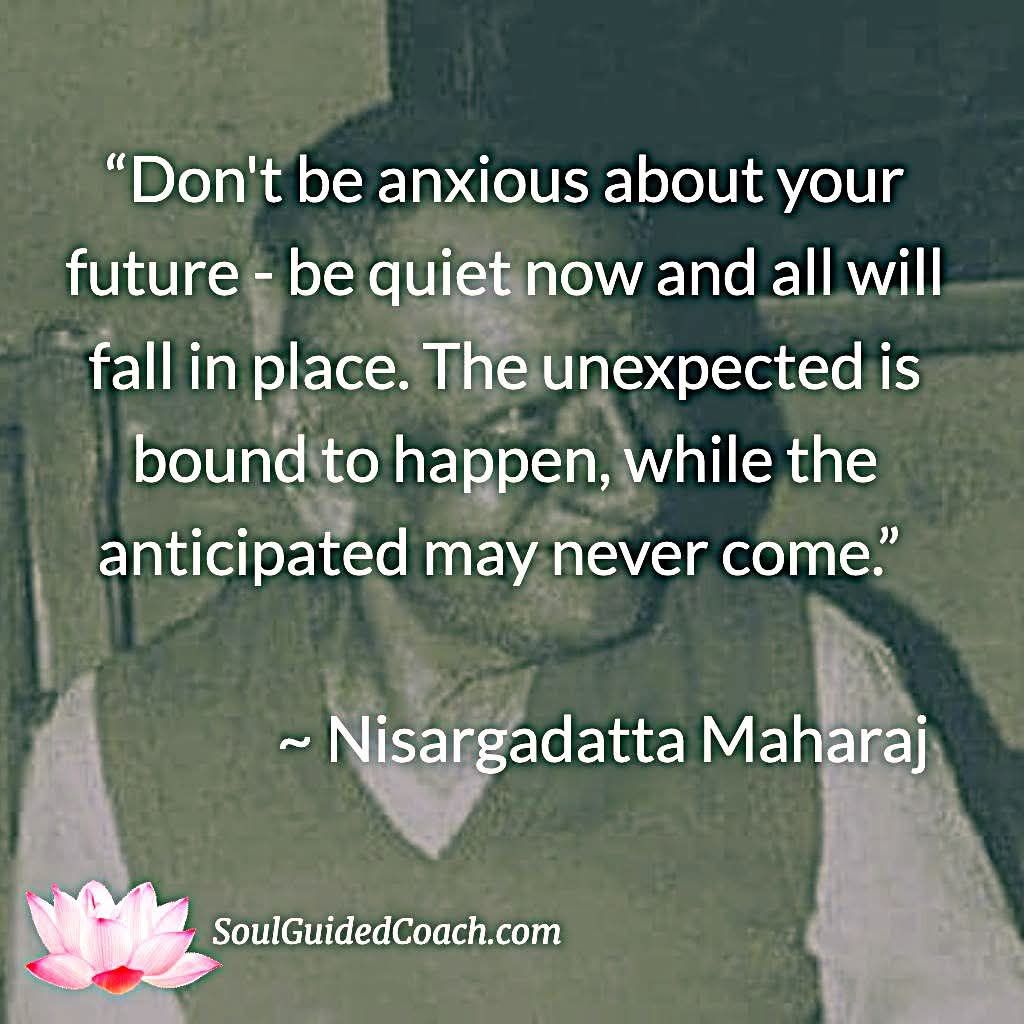 “Don’t be anxious about your futureтАФbe quiet now and all will fall in place. The unexpected is bound to happen, while the anticipated may never come.” That is the teaching of Nisargadatta Maharaj.